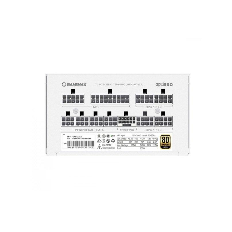 FONTE GAMEMAX GX850 PRO, 850W, 80 PLUS GOLD, FULL MODULAR, PFC ATIVO, WHITE, GX850PWTPS18810BR