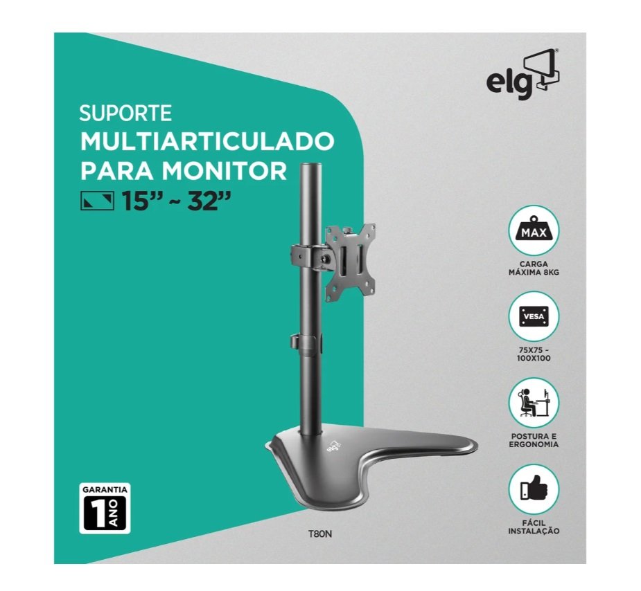 O suporte de mesa T80N da ELG é a solução ideal para quem busca mais liberdade de espaço na área de trabalho, sem abrir mão do conforto e da ergonomia. Com sua base autônoma, ele dispensa furos e fixações, sendo perfeito para monitores de 15″ a 32″.